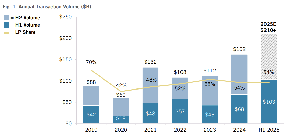 With traditional exit routes not enough to clear portfolios, secondaries have become a primary source of liquidity for LPs and a strategic tool for ageing GP portfolios. Global secondary transaction volume reached $103B in H1 2025, up 51% year on year, with LP-led deals totalling $56B and accounting for 54% of activity, and GP-led volume at $47B, up 68% versus H1 2024. In practice, this meant LPs used portfolio sales to recycle capital and reshape allocations, while GPs relied on continuation vehicles to retain high-conviction assets and provide liquidity to investors without forcing outright exits in a still uneven market.
