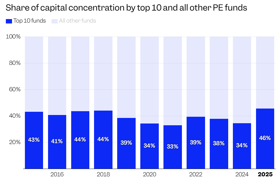 Within that smaller pool of capital, concentration intensified drastically. In the US, nearly 46% of all PE cash raised in 2025 went to the ten largest funds, up from 35% in 2024, while first time funds closed at record low amounts. At the same time, LPs moved away from blind pool commitments and took part in more targeted exposure, with statistics showing around 80-90% of institutional investors now planning to allocate up to 20% of their PE capital to co-investments.